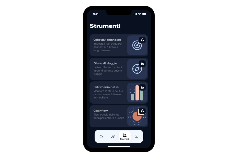 Con il tool “Obiettivi finanziari” imposti i tuoi traguardi di vita, stabilisci un piano d’azione per raggiungerli e monitori i risultati. Con il tool “Patrimonio Netto” calcoli la tua attuale ricchezza e la monitori nel tempo. Con il tool “Bilancio”, non solo annoti entrate e uscite. Ma analizzi il tuo modo di spendere e inizi a farlo in maniera intenzionale.